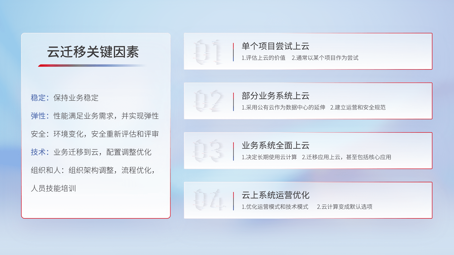 结合实际业务,,从规划设计、、、、云平台选型、、云原生改造、、、数据迁移、、、、集成交付,,,迁移全过程为客户识别最佳上云路径,,做好风险识别管理,,,设计网络架构、、、、身份权限、、安全审计合规、、、操作审计、、日志审计、、监控告警策略、、、多站点容灾设计等,,,,对云上基础设施进行整体规划,,,,提升IT治理水平,,,,以满足弹性、、高可用、、、高性能的需求。。。。