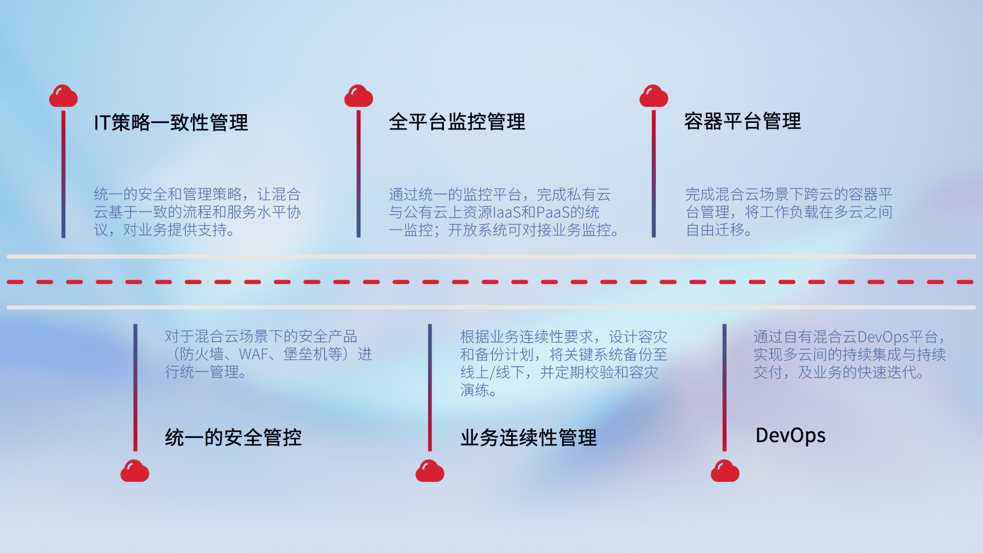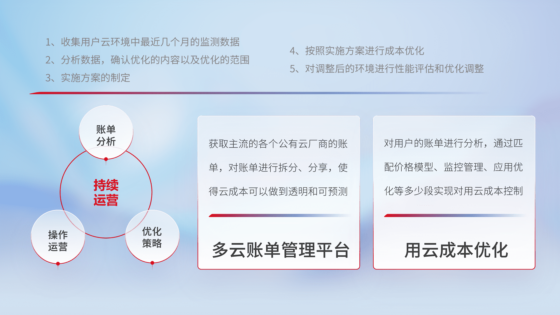 通过多云纳管,,以统一的资源数据模型把客户的云资源进行抽象和封装,,,进而实现对多云资源的统一操作,,,保障云资源管理的可靠性、、、、稳定性与可用性。。量身定制化运维内容,,,,配置、、、开发运维、、、补丁管理、、、、备份、、监控、、、认证和访问管理、、、、审计和日常巡检等,,保障在用云过程中的可靠度,,稳定度以及高可用率。。。。